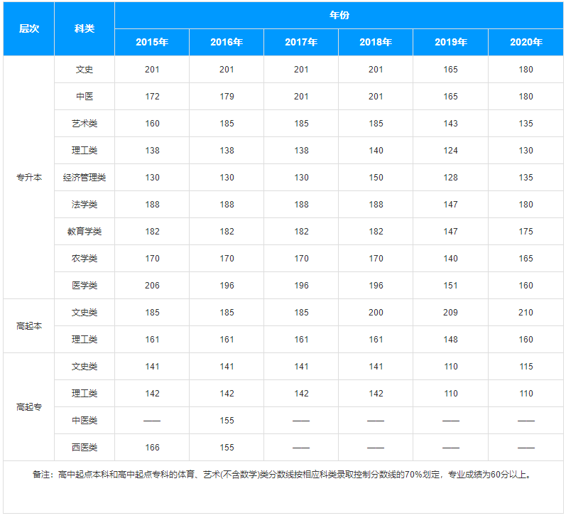 專升本:文史類:190,中醫類:190,藝術類:140,理工類:135,經濟管理類:139,法學類:178,教育學類:180,農學類:160,醫學類:170。