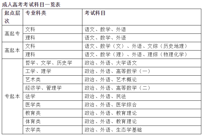 當然了以上指的是文化課考試,藝術類、體育類等的專業(yè)加試課不算。以下是成考的各個層次的科目: