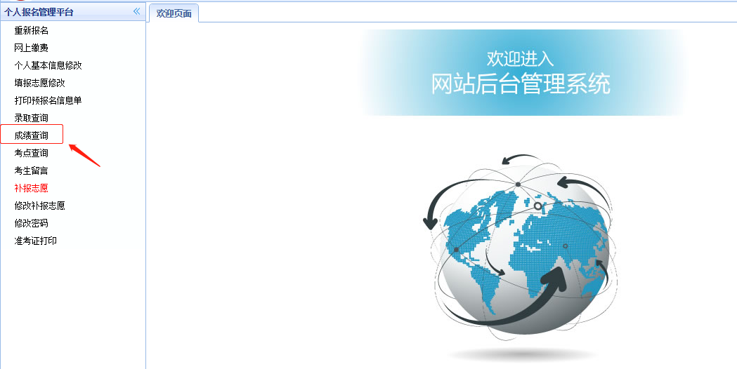 第四步:進入個人報名管理系統,點擊左側導航欄中的“成績查詢”。