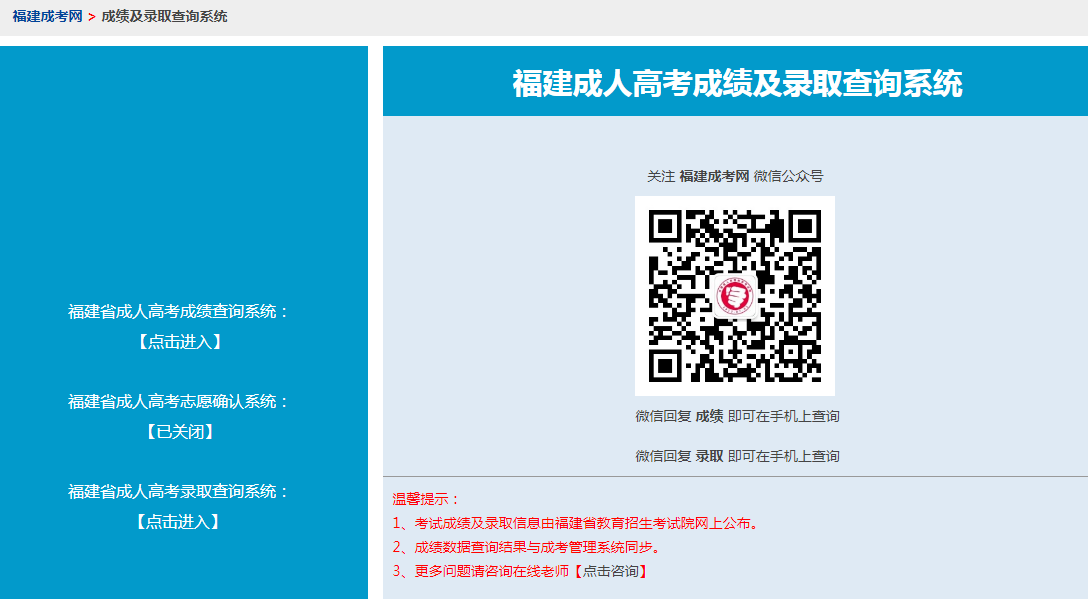 以上就是有關(guān)福建成人高考錄取查詢(xún)流程的簡(jiǎn)要介紹,具體以考試院當(dāng)年相關(guān)通知公告為準(zhǔn)。更多成考資訊,敬請(qǐng)關(guān)注網(wǎng)站及公眾號(hào)最新通知!