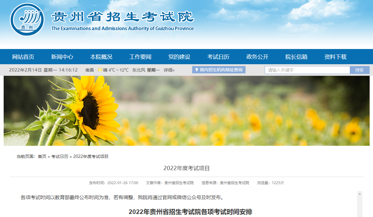 根據貴州省招生考試院發布的《2022年度考試項目》獲悉,2022年成人高考考試時間安排如下: