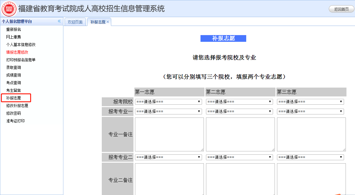 志愿補報地址:http://m.guangquan.net/cjcx (此地址也可以查詢錄取結果),點擊進入,使用用戶名和密碼登陸,點擊左側“補報志愿”。