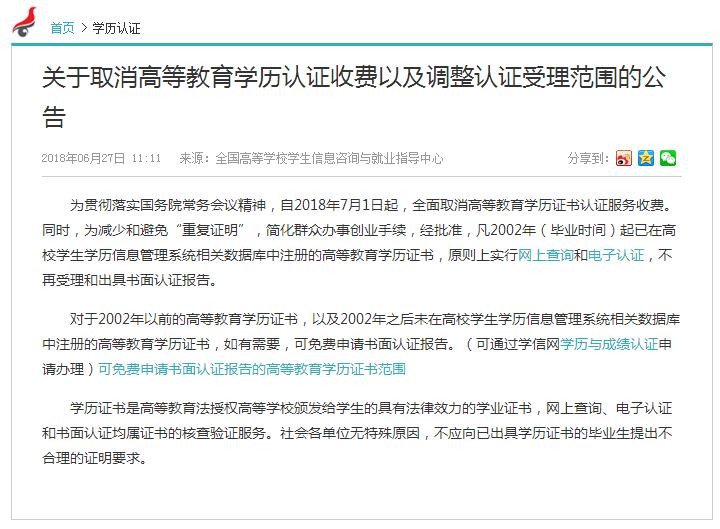 關于取消高等教育學歷認證收費以及調整認證受理范圍的公告
