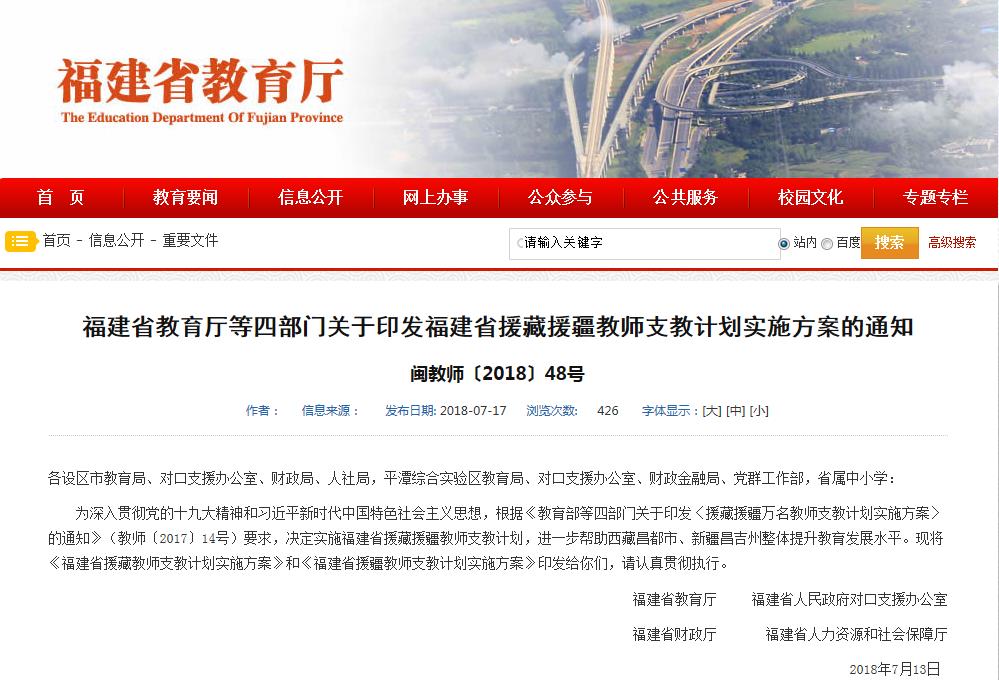 【導(dǎo)讀】7月13日,福建省教育廳公布,福建省教育廳等四部門關(guān)于印發(fā)福建省援藏援疆教師支教計劃實施方案的通知,以下是通知內(nèi)容: