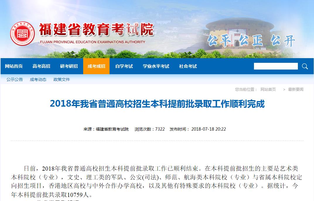福建省高考:2018年本科提前批錄取已落幕 共錄取10759人