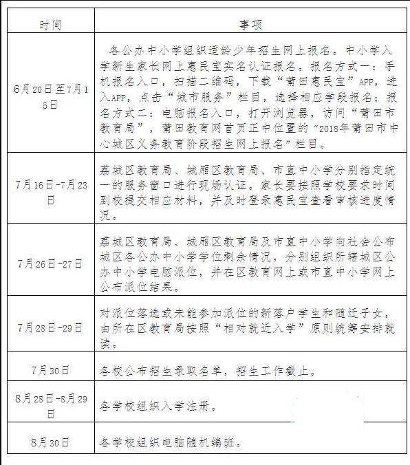 1.網上報名時間:6月20日至7月15日。具體方式見附件《莆田市2018年秋季中心城區義務教育階段公辦學校網上報名流程》。網上報名時只能選擇戶籍或暫住地相應片區的公辦學校,不得跨區跨校重復報名,否則報名無效。